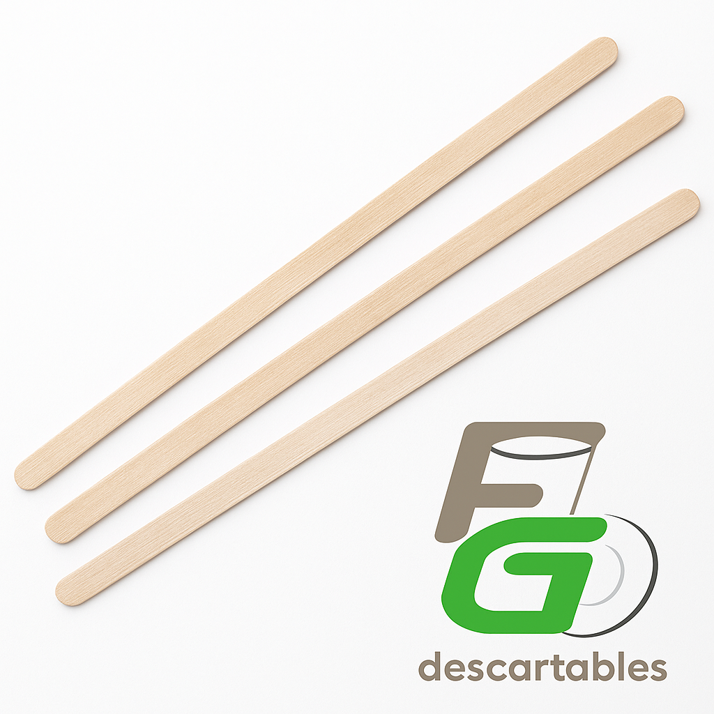 Prácticos agitadores de madera natural de 18 cm, ideales para remover café, té y otras infusiones. Presentación en pack de 200 unidades, perfectos para bares, cafeterías, restaurantes o uso en oficinas. Producto 100% biodegradable y amigable con el medio ambiente.