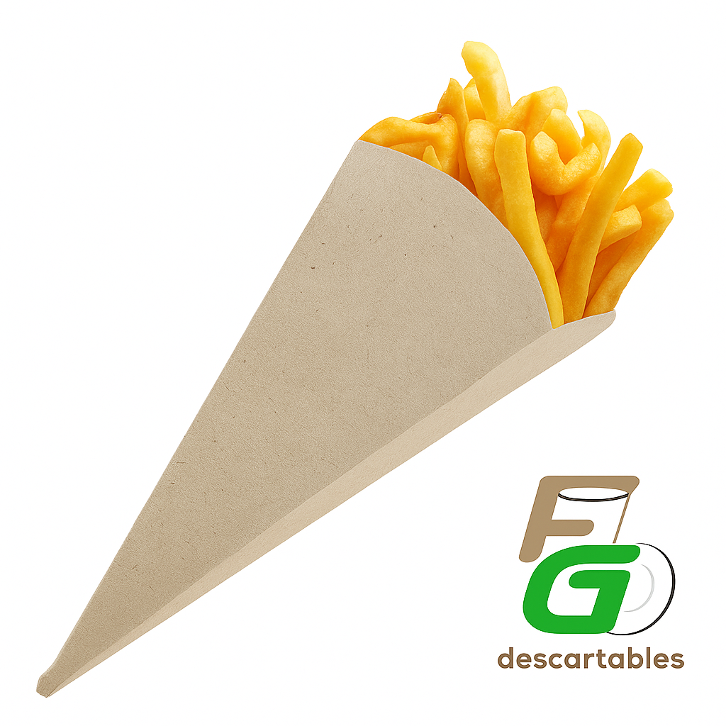 El Cono para Papas Fritas FG Descartables es práctico, resistente y estéticamente ideal para servir snacks, papas fritas, churros o alimentos para llevar. Fabricado en cartón kraft o gris reciclable, ofrece una excelente presentación y mantiene la temperatura de los alimentos sin engrasarse.