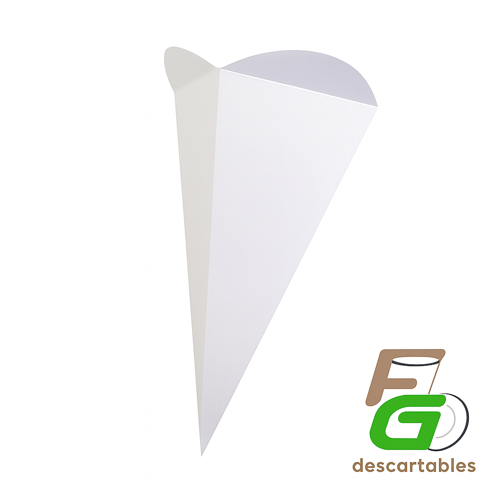 El Cono para Papas Fritas de Cartulina Blanca de FG Descartables es ideal para servir porciones individuales de papas fritas, snacks, churros o finger food con una presentación impecable y práctica.