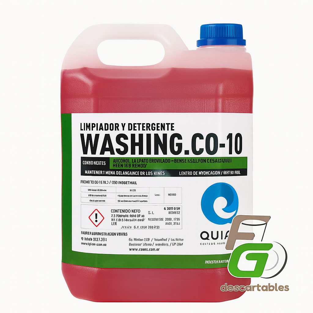 El detergente y limpiador Washing.CO-10 está formulado para brindar una limpieza profunda y efectiva en múltiples superficies. Gracias a su composición con alcohol láurico etoxilado y agentes desinfectantes, elimina la suciedad difícil y ayuda a mantener la higiene en espacios de uso industrial o doméstico. Presentación en bidón de 5 litros, ideal para un uso prolongado y económico.