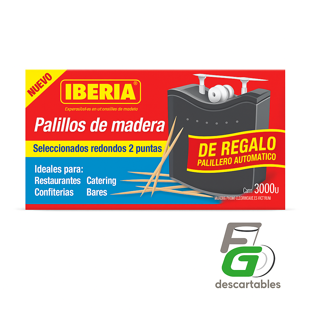 Prácticos y resistentes palillos de madera seleccionada, con diseño redondo y doble punta para mayor comodidad. Vienen en una presentación de 3000 unidades, ideal para restaurantes, bares, confiterías, caterings o cualquier servicio gastronómico que requiera higiene y practicidad.