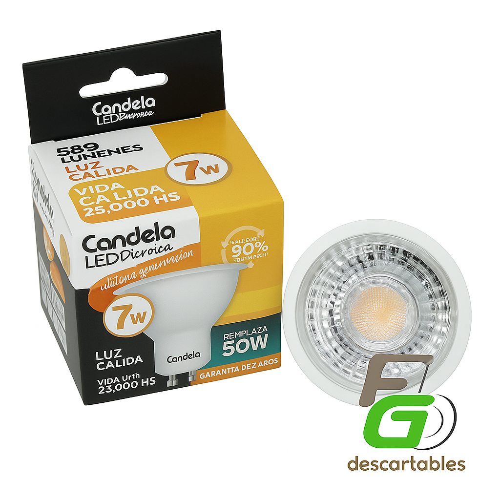 Iluminá tus espacios con la eficiencia y calidez de la Dicroica LED 7W Candela. Ideal para crear ambientes acogedores, esta lámpara de última generación emite una luz cálida suave, perfecta para hogares, locales comerciales y espacios de descanso.