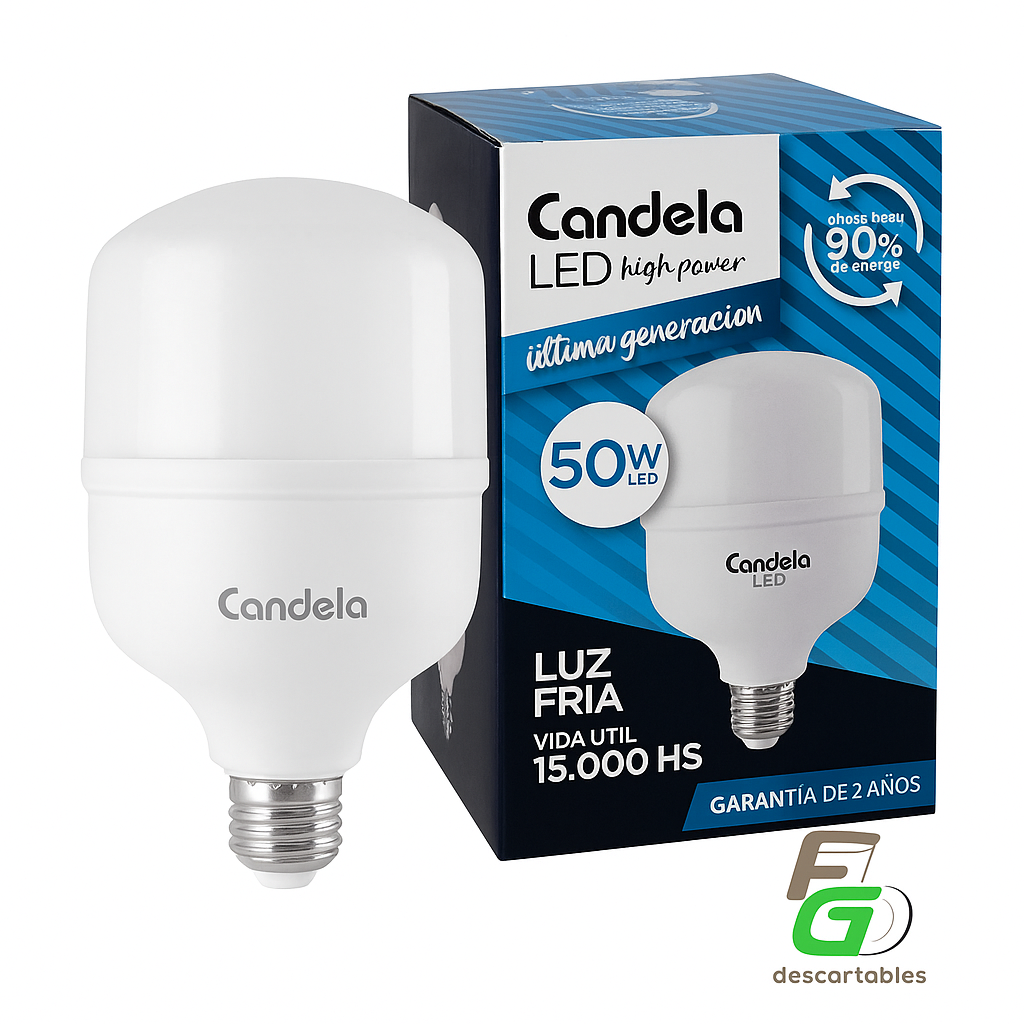La Lámpara LED Candela 50W Luz Fría ofrece una iluminación potente, clara y eficiente para grandes espacios. Diseñada con tecnología LED de alta potencia, brinda un ahorro energético de hasta 90% respecto a las lámparas convencionales, sin perder intensidad lumínica.