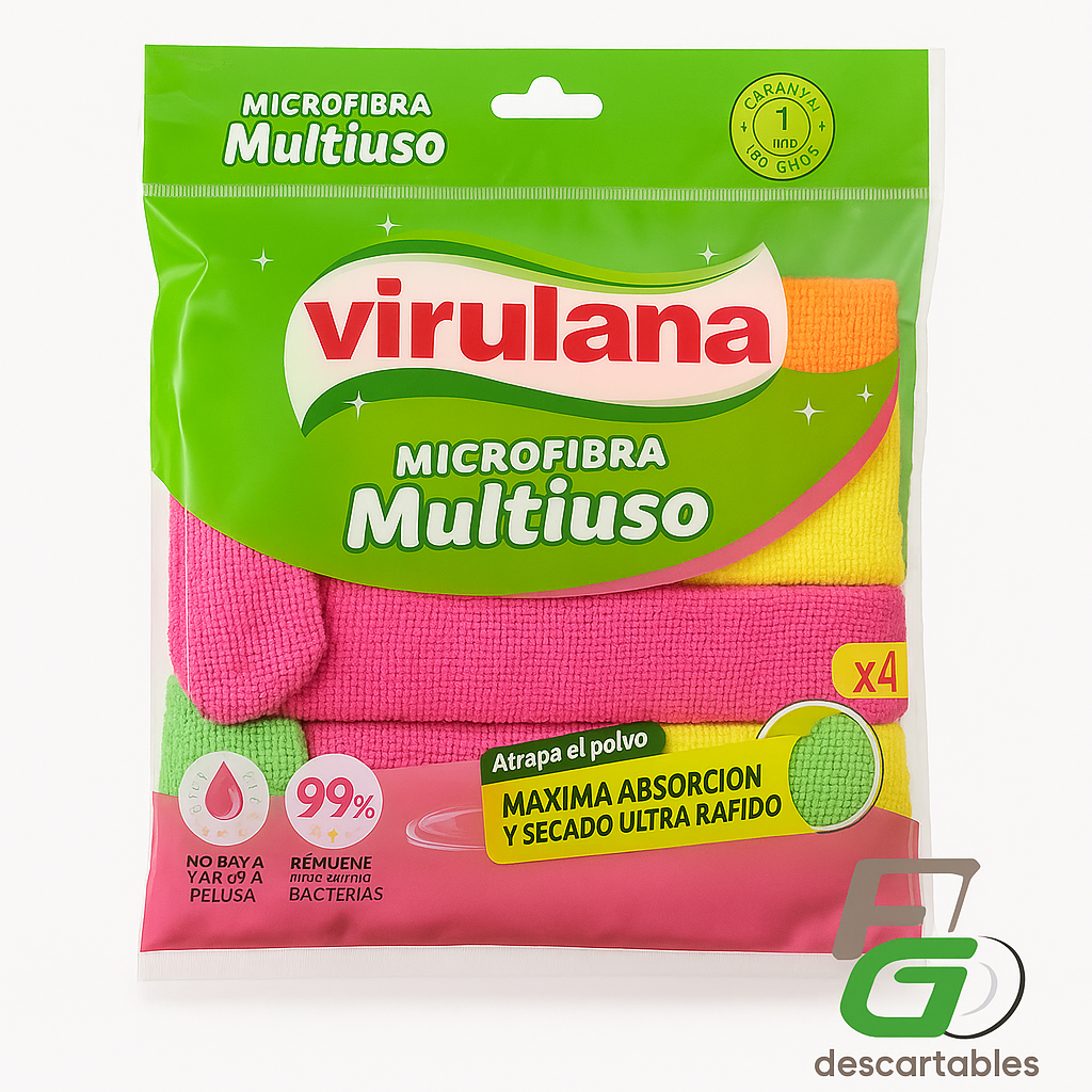 Los paños de microfibra multiuso Virulana son ideales para la limpieza diaria de todo tipo de superficies. Su tecnología atrapa el polvo de manera efectiva, absorbe líquidos rápidamente y permite un secado ultra rápido sin dejar pelusas ni rayas.