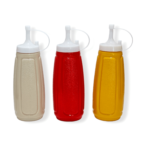 Dosificador plástico para salsas, ketchup, mayonesa o mostaza. Incluye tapa con boquilla dosificadora y precinto de seguridad. Fabricados en material resistente, ideales para uso en cocinas, food trucks o eventos. Colores vivos para una rápida identificación.