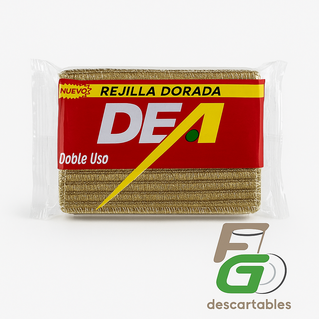 La Rejilla Dorada DEA es práctica, resistente y de doble uso, ideal para la limpieza de cocina y superficies difíciles. Su textura metálica permite remover grasa y suciedad con mayor eficacia, cuidando tus utensilios y brindando un brillo superior.