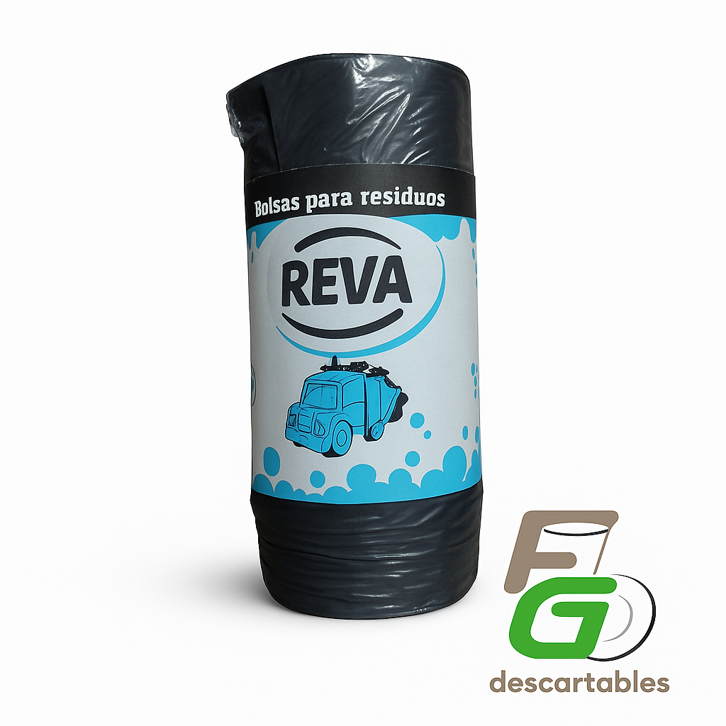 Rollo de 20 bolsas de residuos negras tamaño 50 x 70 cm, marca REVA. Indicadas para cestos medianos en hogares, oficinas y comercios. Ofrecen buena resistencia para residuos cotidianos, permiten un cierre seguro y una gestión higiénica de la basura. Prácticas, económicas y fáciles de usar en el día a día.