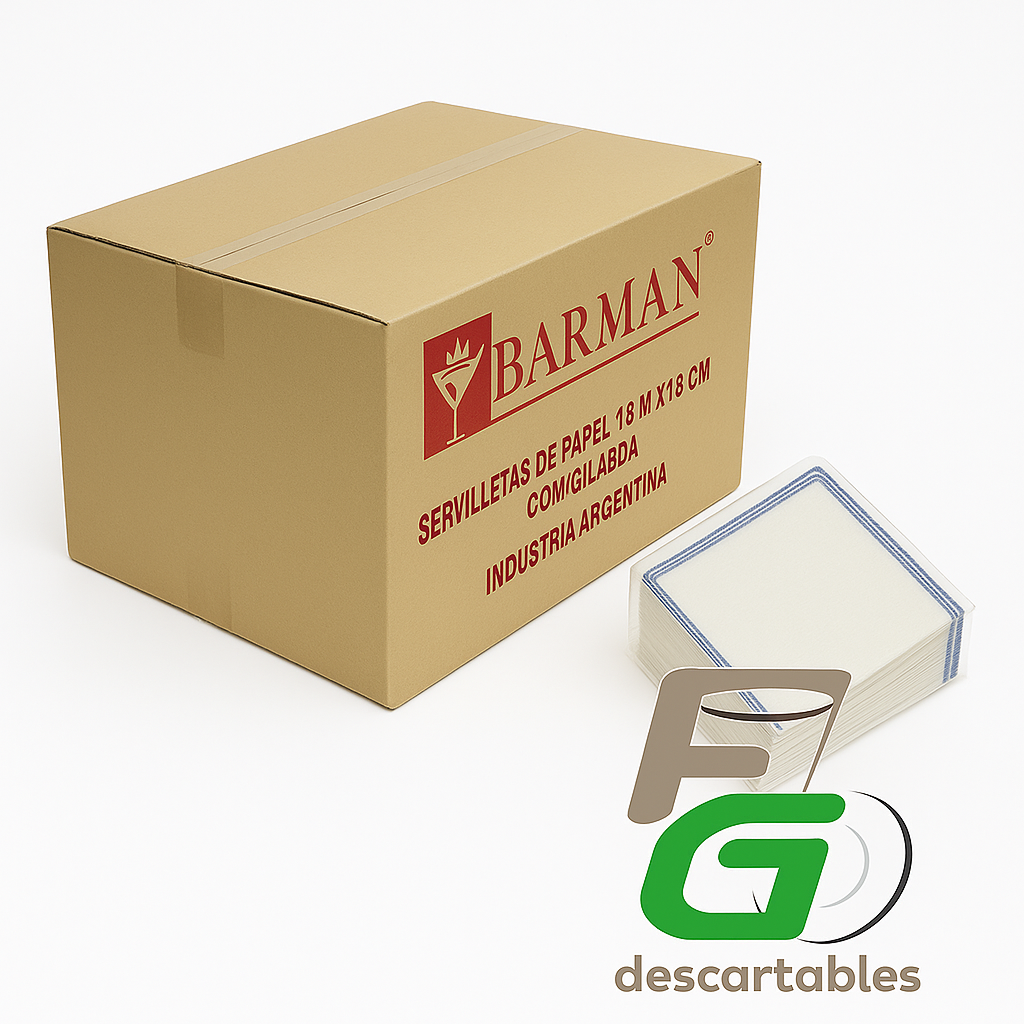 Servilletas BARMAN de papel tissue blanco con guarda azul, tamaño 18×18 cm, ideales para bares, eventos, cafeterías y servicios gastronómicos.